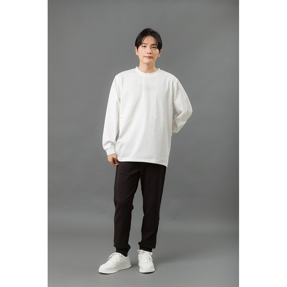 胸元の立体ロゴがさりげないアクセントとなり、シンプルながら洗練された印象に。